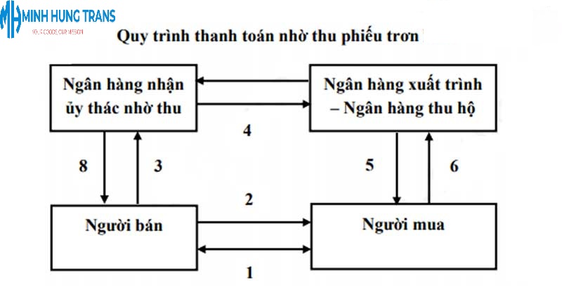 Quy trình nhờ thu bao gồm các bước sau: Người bán gửi chứng từ đến ngân hàng của mình >>>>> Ngân hàng này sẽ gửi chứng từ đến ngân hàng của người mua kèm theo yêu cầu thanh toán >>>>> Ngân hàng của người mua sẽ thông báo cho người mua về việc nhận chứng từ và yêu cầu thanh toán >>>>> Sau khi người mua thanh toán hoặc chấp nhận thanh toán, ngân hàng sẽ giao chứng từ cho người mua và chuyển tiền cho người bán.