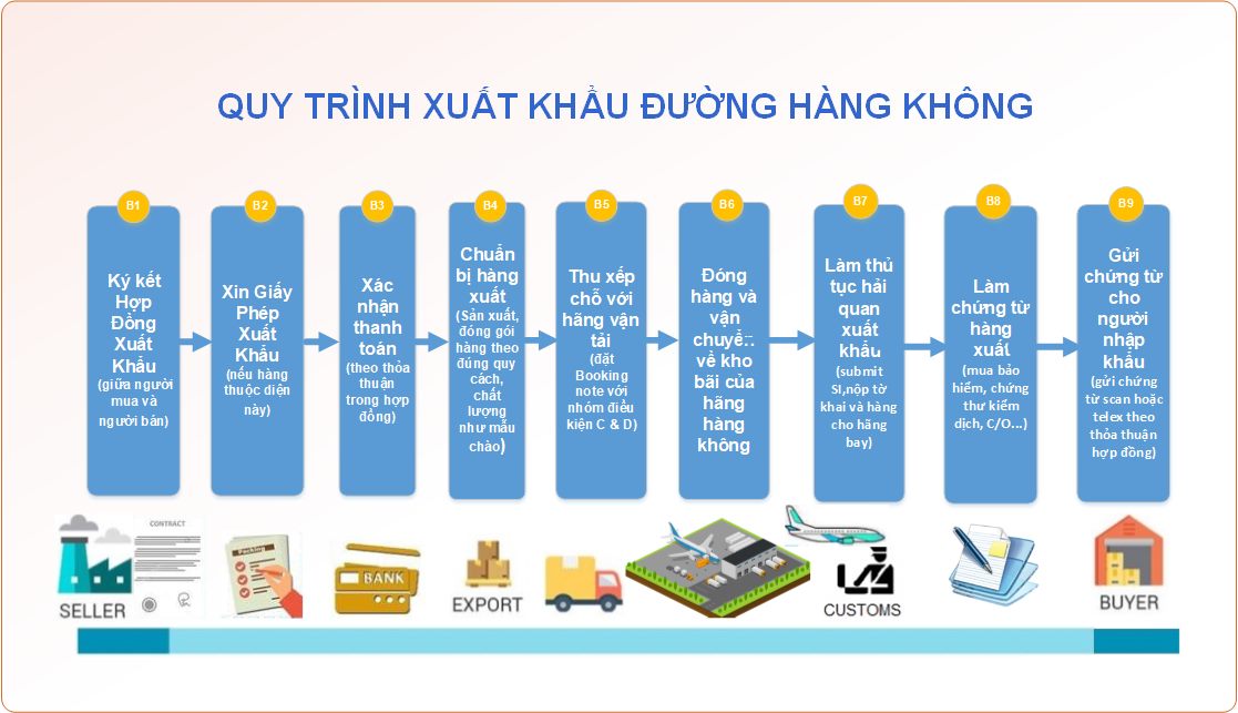 Quy trình xuất khẩu hàng hóa bằng đường hàng không bao gồm nhiều bước và được thực hiện theo một quy trình cụ thể như sau: